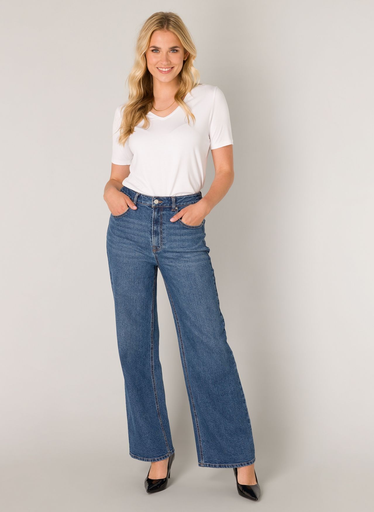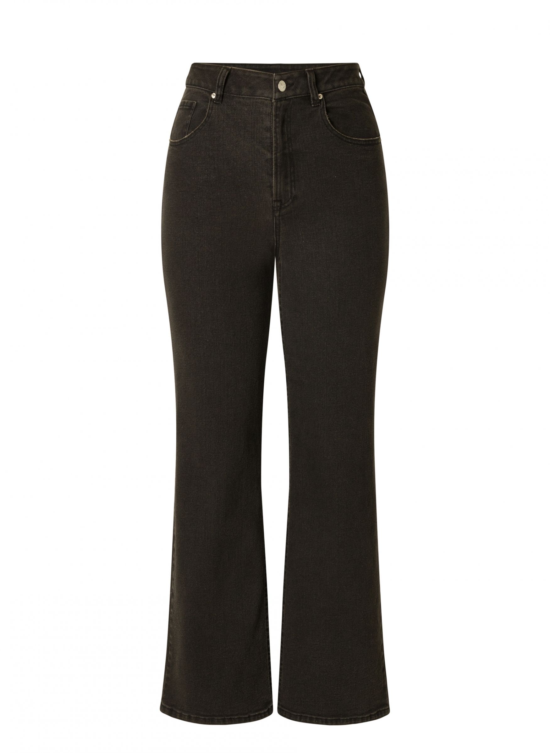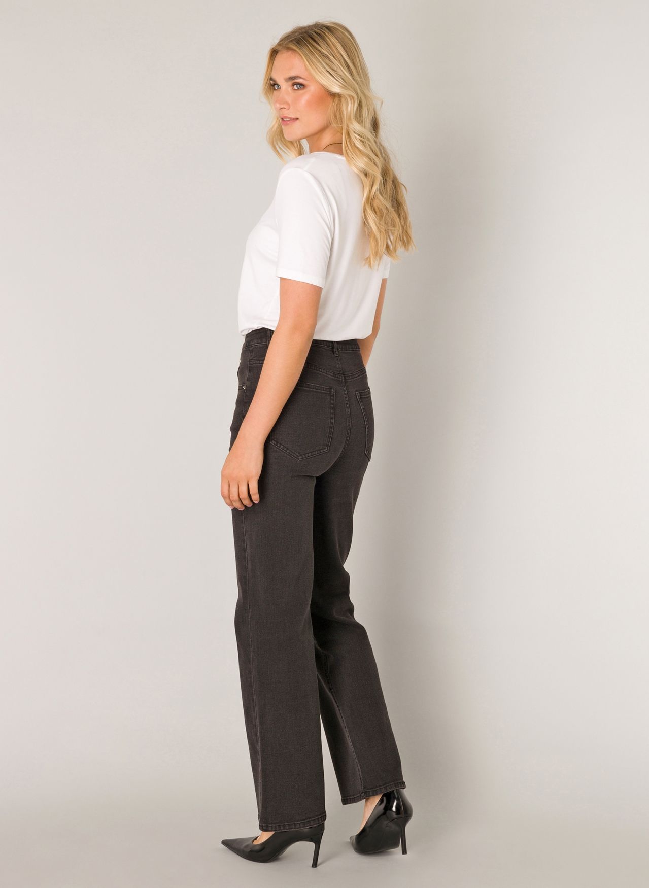 Amy is a high-rise/wide-leg fit five-pocket denim in an elastic cotton blend. The pants have wide flared legs and a zip and button closure. 30″ Leg.