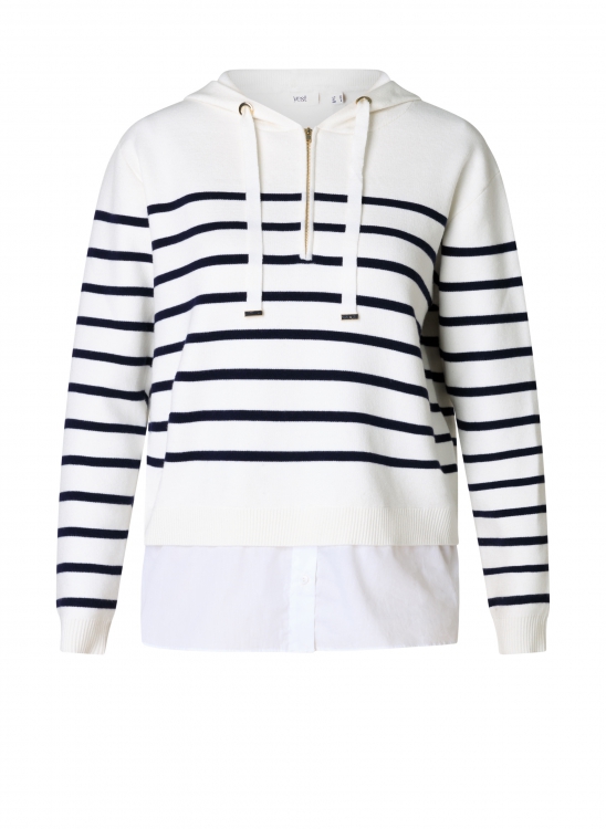 How cute is this combo sweater? The stripes give it that fresh, nautical vibe, the hood makes it nice and casual, and the blouse hem at the bottom creates an instant layered lookâwithout any effort. A comfy, stylish piece that you can just step out the door in.