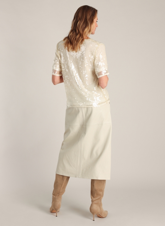 A festive top with a shiny sequin layer in a soft, winter white colour. The transparent fabric is lined with a top underneath. Features a V-neck and short sleeves. The comfortable, loose fit creates a supple silhouette that is pleasant to wear.