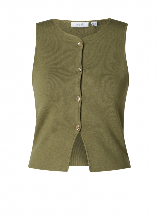 This knitted sleeveless cardigan is made from a soft viscose-nylon blend and has a fine, smooth knit. The shiny buttons are a subtle detail that makes the design just a little bit more chic. Available in olive and light gray, two calm shades that are easy to combine.