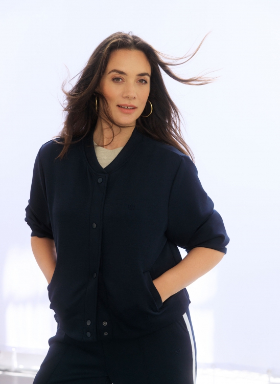 This jacket is guaranteed to become a favorite. So soft, so supple, and super relaxed thanks to the bomber style. The snap buttons make it extra easy to wear, and the navy and antique white colors go with everything. A comfy layering piece you’ll enjoy every day.