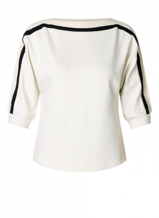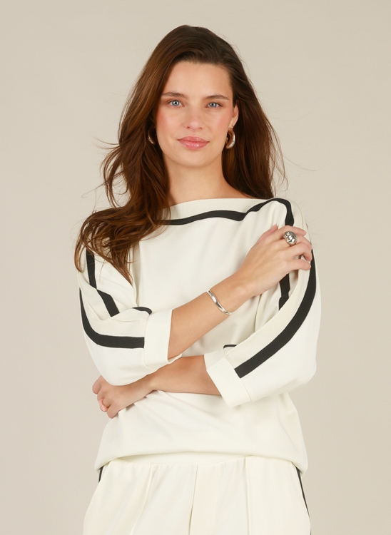 This knitted sweater has a classic boat neck and is finished with a subtle contrasting trim along the neckline and sleeves. The soft fabric is comfortable to wear and has a supple drape. Available in antique white, it can be perfectly combined with the matching soft pants for a complete set.