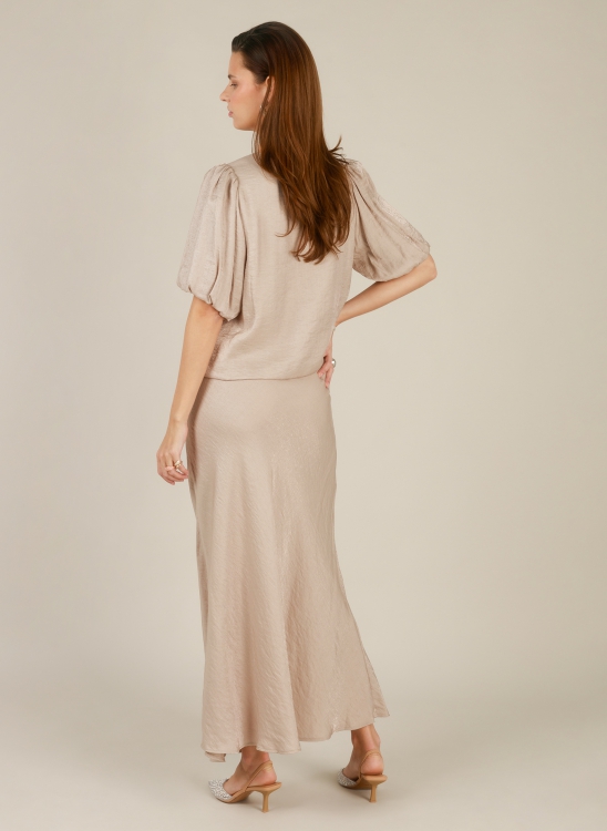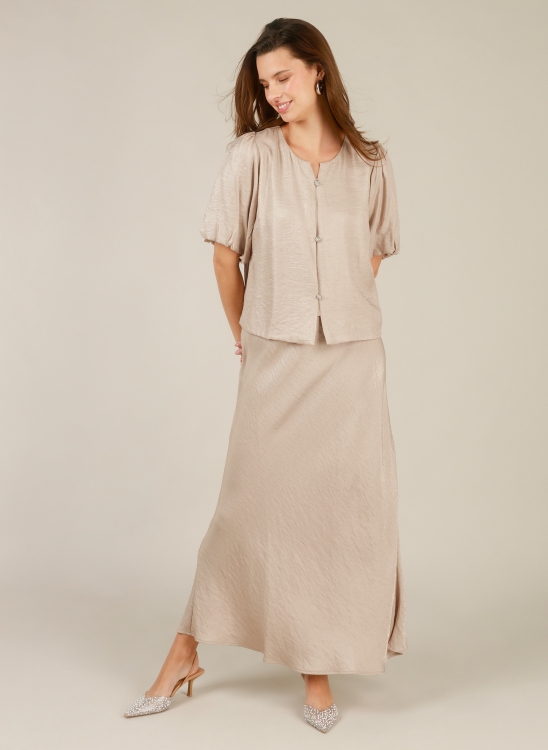 Irma immediately exudes something special. The soft sheen of the fabric, the short silhouette, and the wide sleeves give it a chic yet effortless vibe. The subtle buttons complete the look. It looks beautiful in light taupe—especially with the matching skirt.