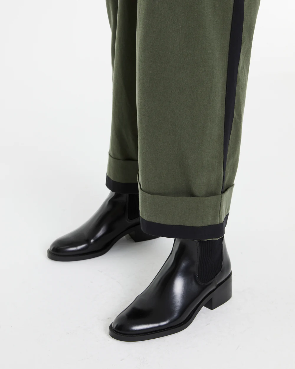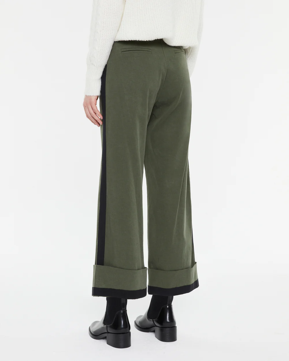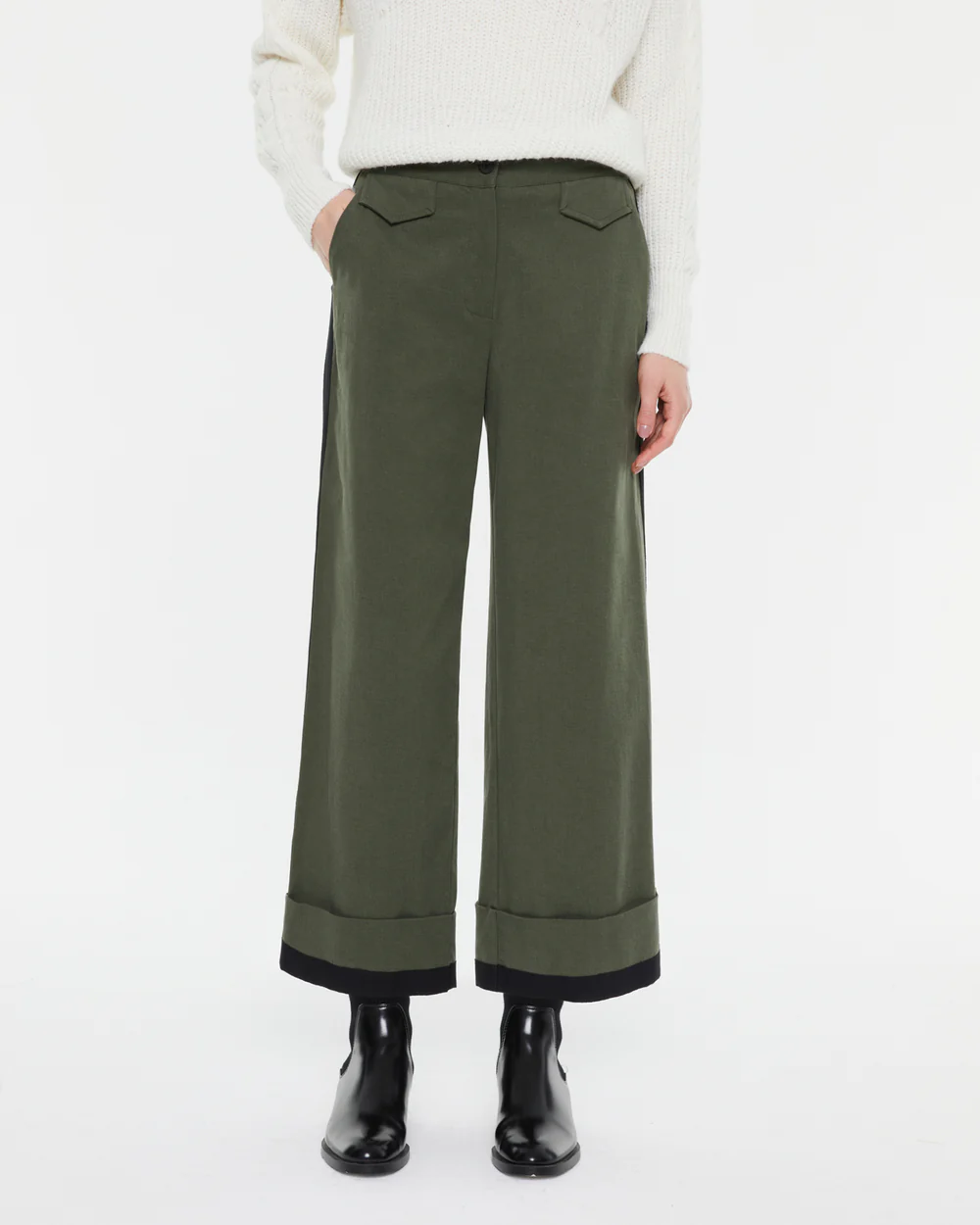 High-waisted, wide-leg ankle pants with a button and zip closure. Side pockets and pocket-effect flap detail on the front, and black grosgrain ribbon on the sides and hems.