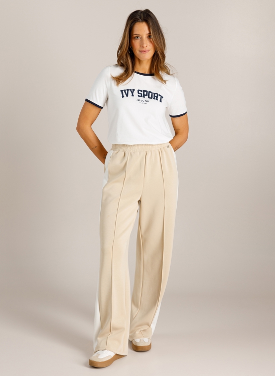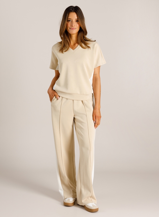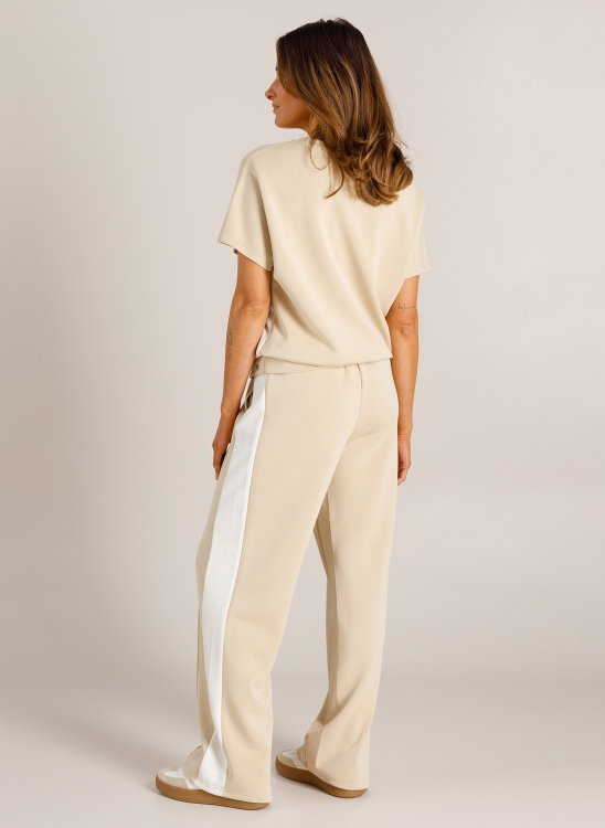 Soft, smooth and sporty! The Vitalia trousers in sand feature handy side pockets and an off-white contrast stripe along the side seam. Made from a wonderfully soft modal blend with wide legs for a relaxed fit. Pair them with the Vyenna sweater for a comfy, stylish set.